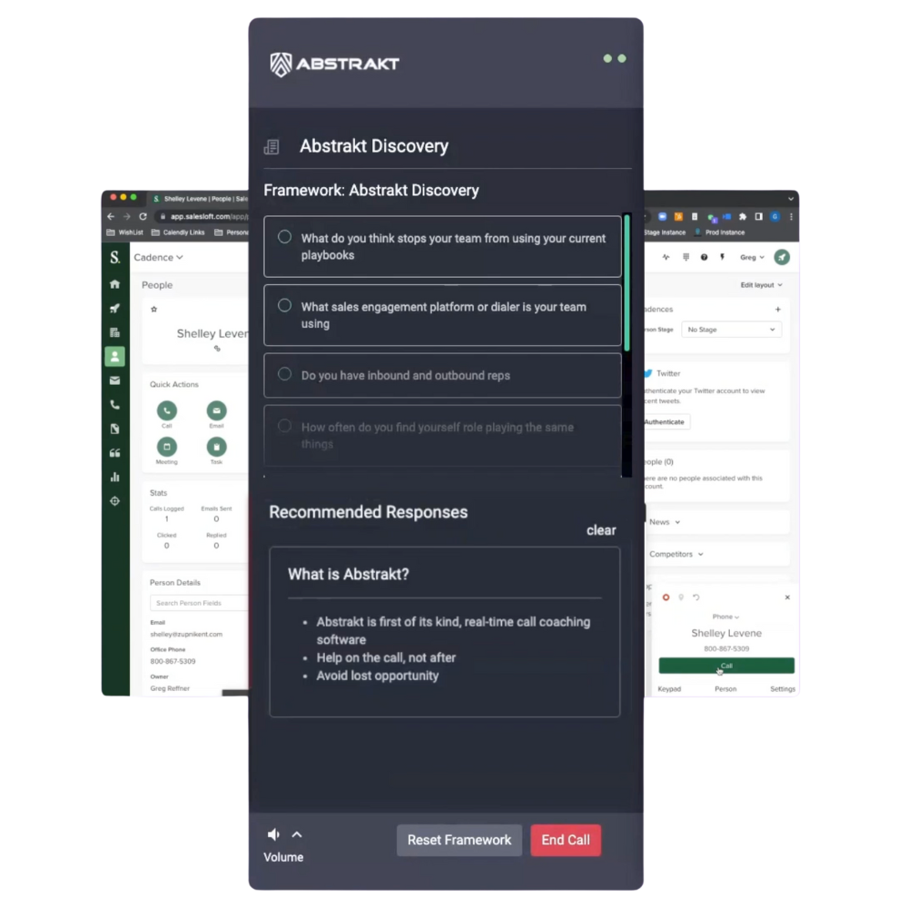 Abstrakt is the only real-time call coaching software that helps reps ensure they are asking the right questions and handling objections all in REAL-TIME. No more whispers, no more barge, no more being reactive.