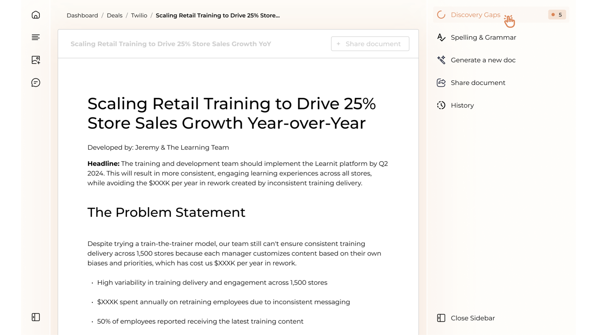- Data-backed content suggestions that highlight deals gaps with suggested discovery questions.