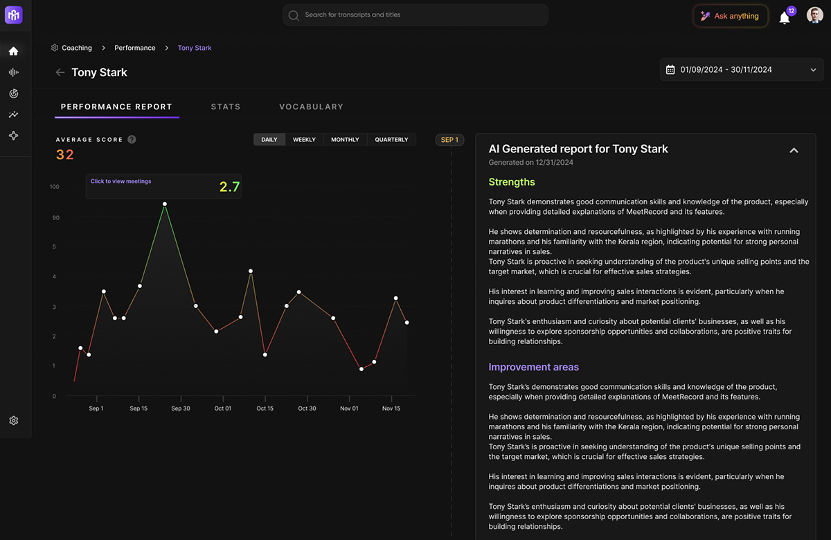 - MeetRecord’s AI scores conversations instantly, providing insights into each rep’s performance.