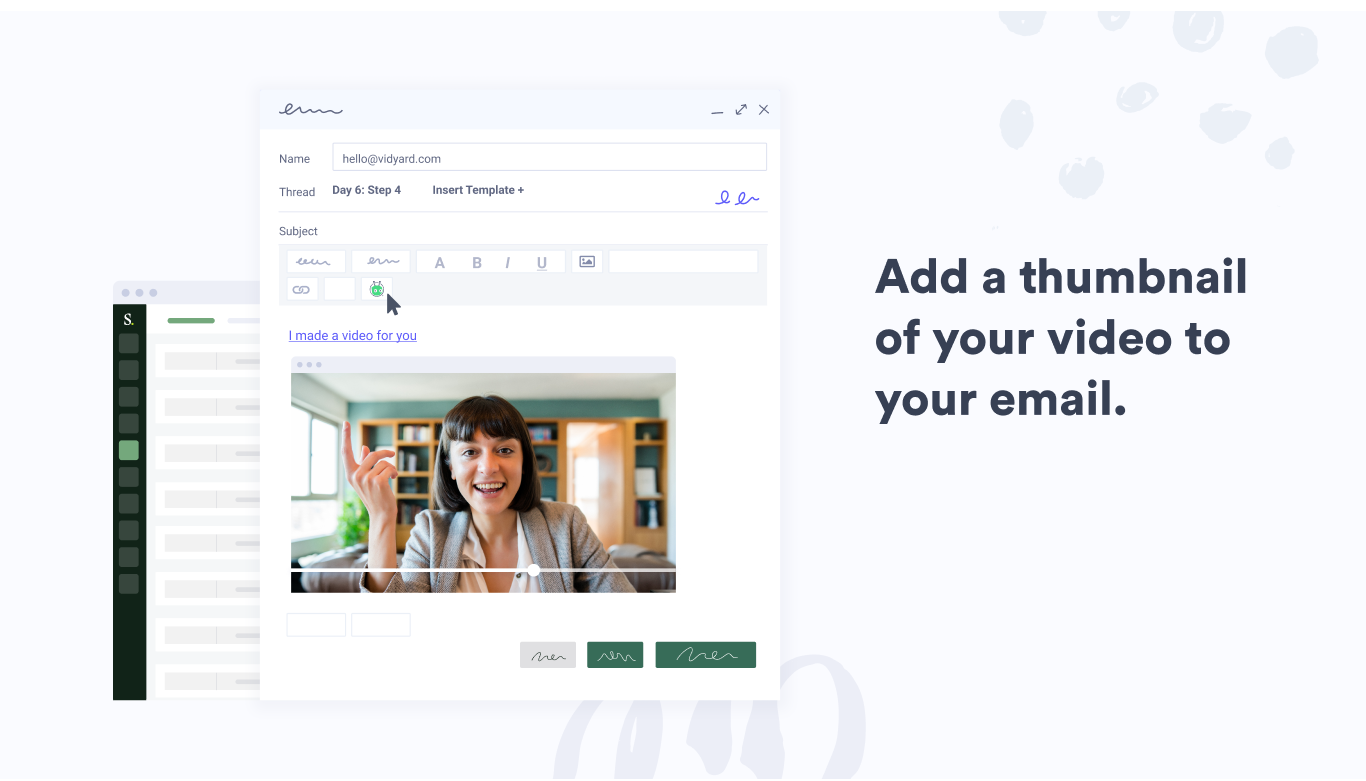 Want to see better results from your Salesloft outreach? Vidyard makes it easy to add personalized videos to your emails and Cadences, helping you increase open rates by 16% and reply rates by 26%. Â