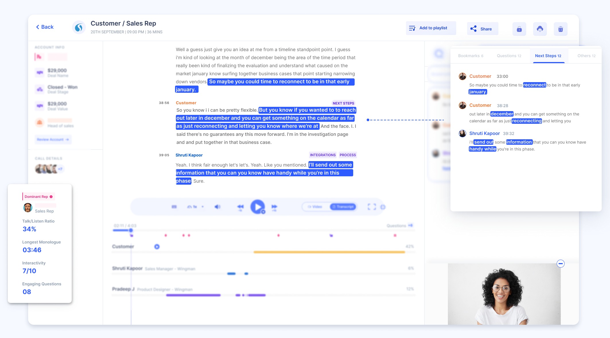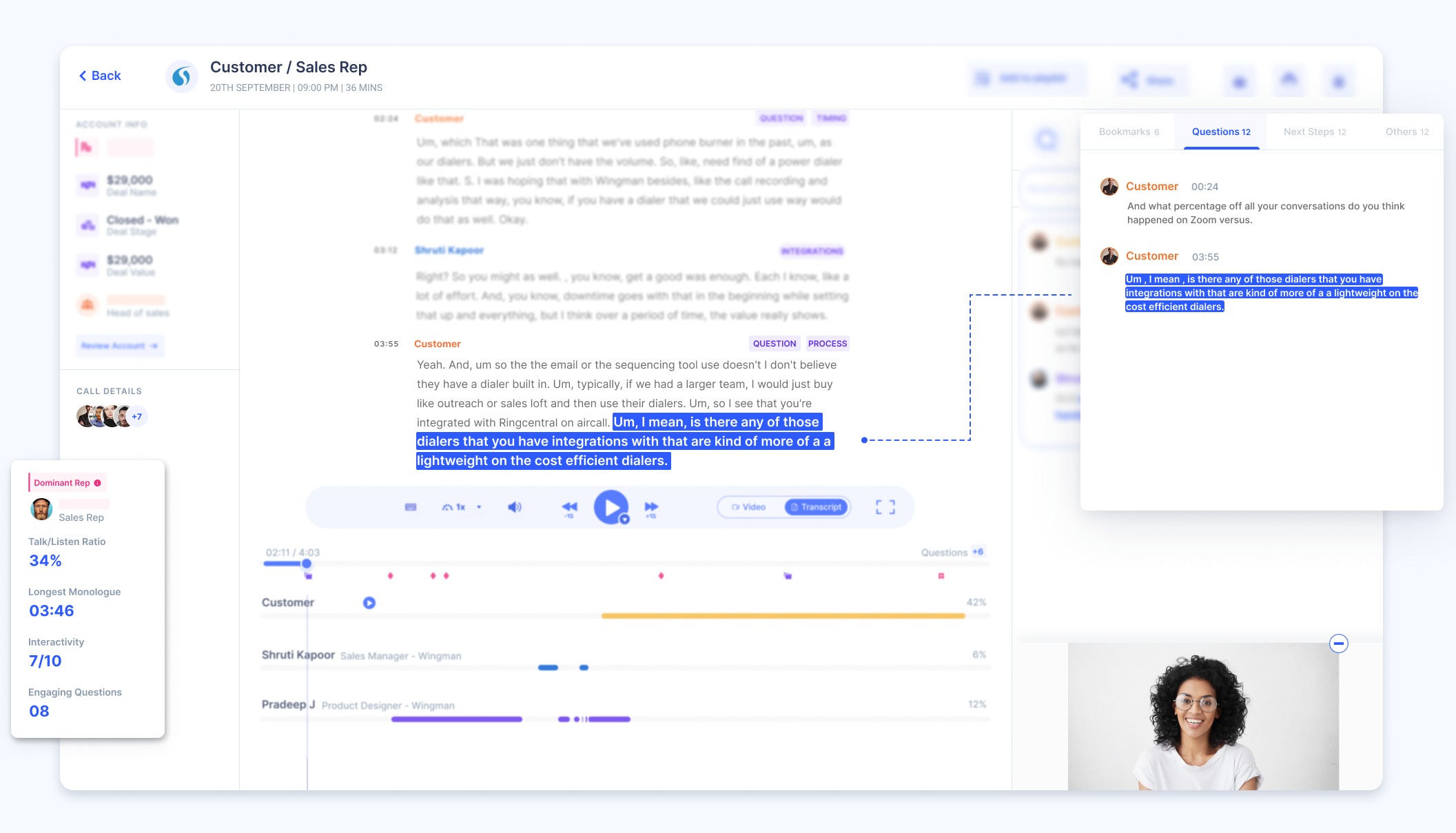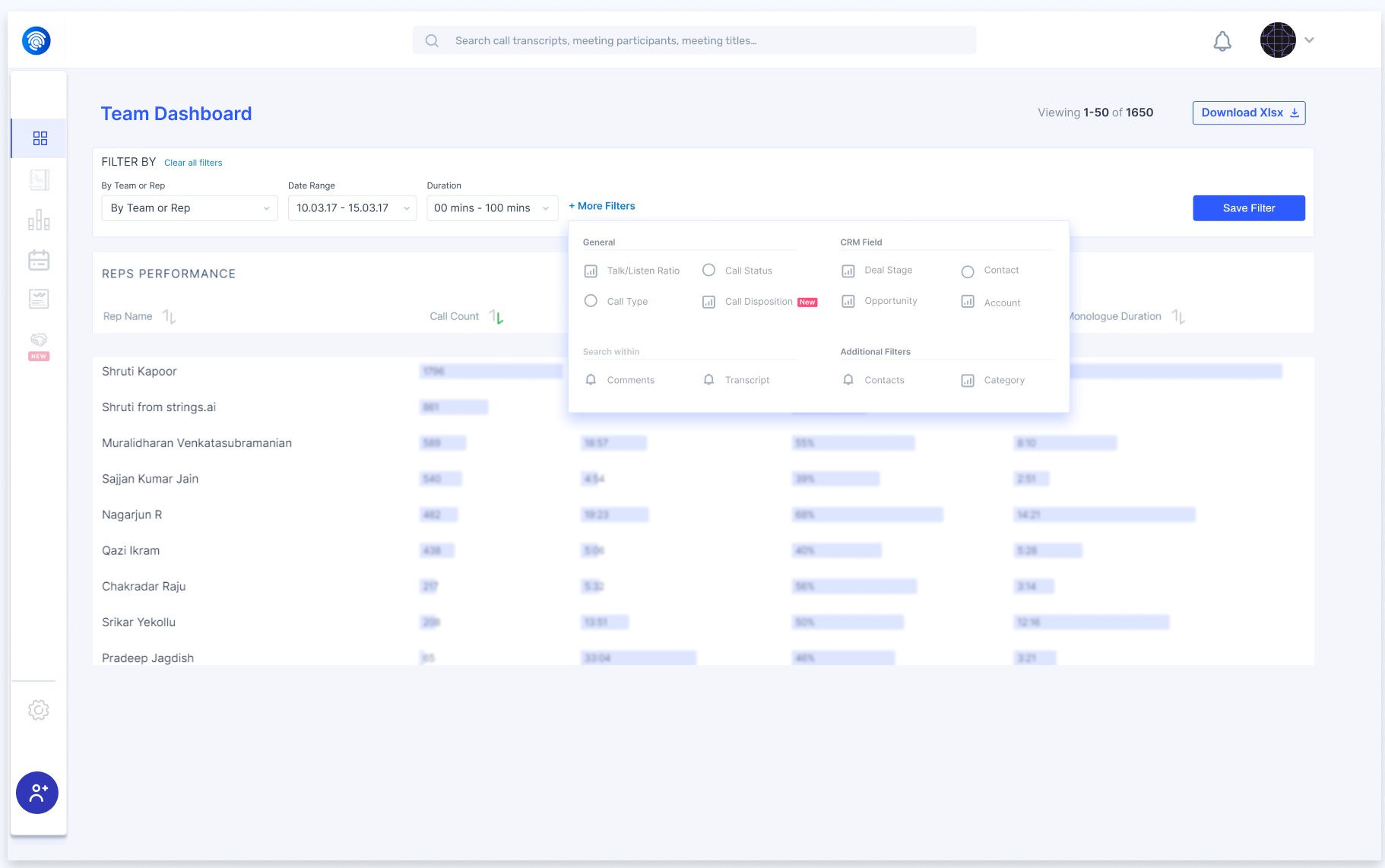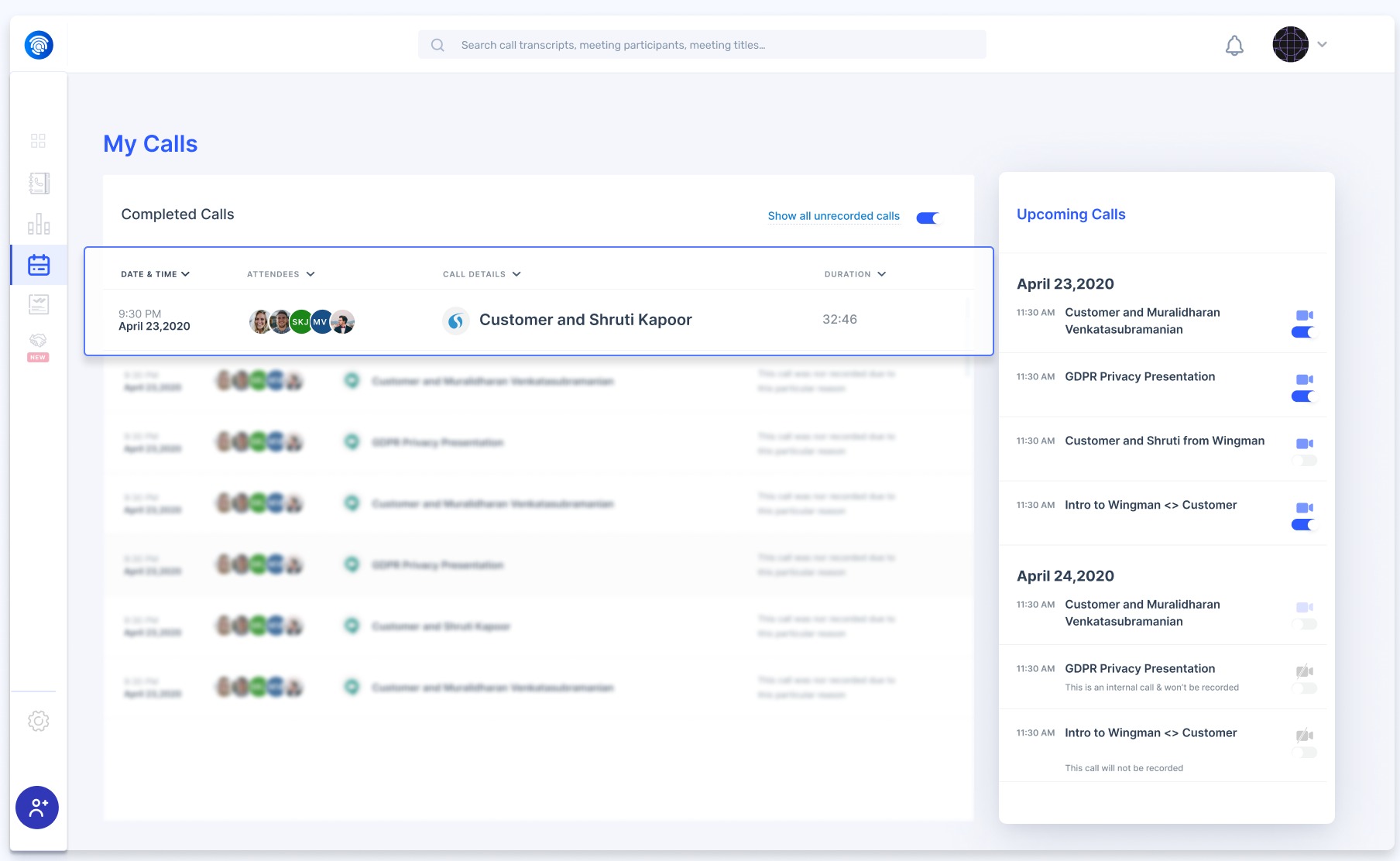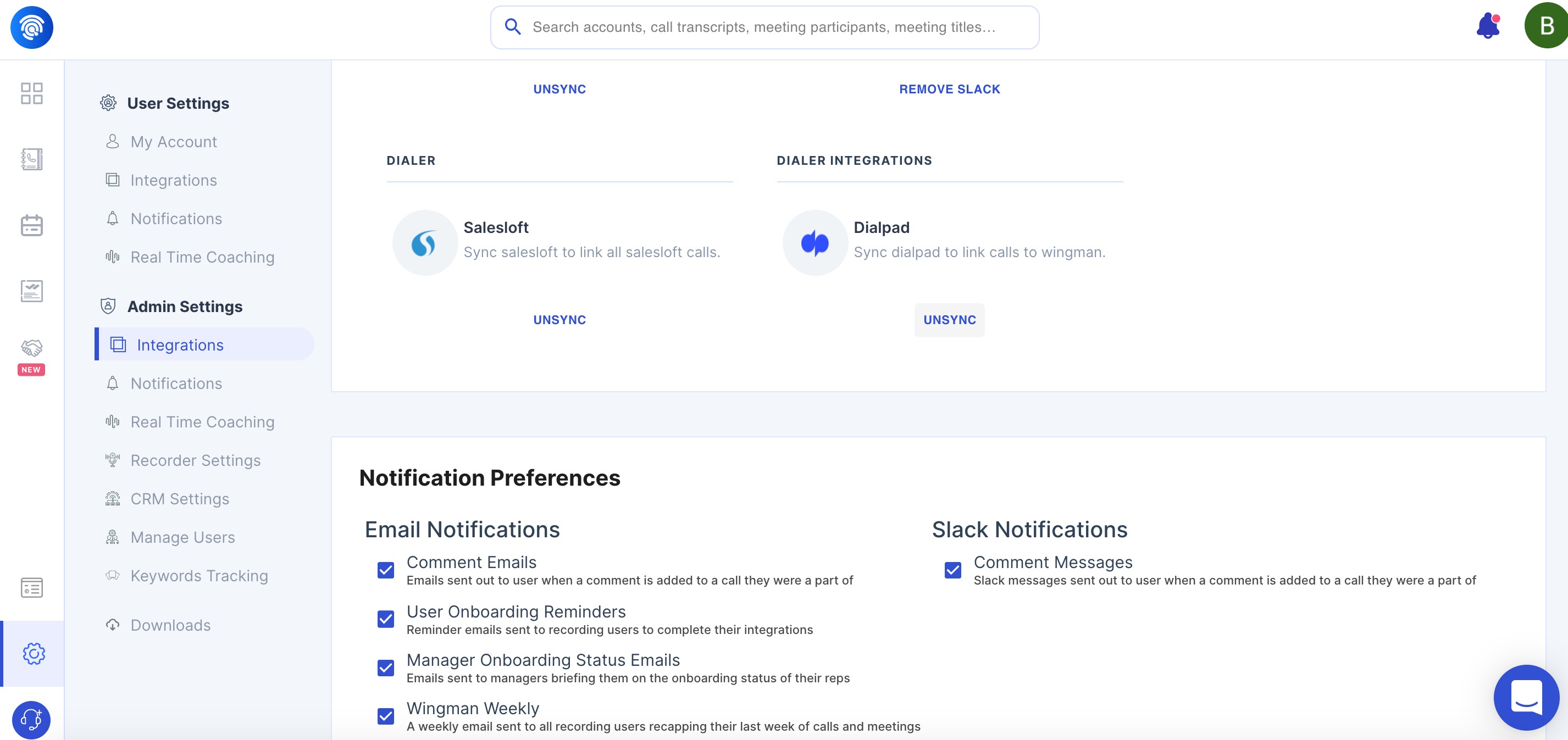 Once you integrate Wingman with Salesloft, It will automatically download the calls (optionally contacts) from Salesloft. It will make your call transcripts available to navigate easily, analyse trends on your sales calls so that you can improve the performance of your sales team.